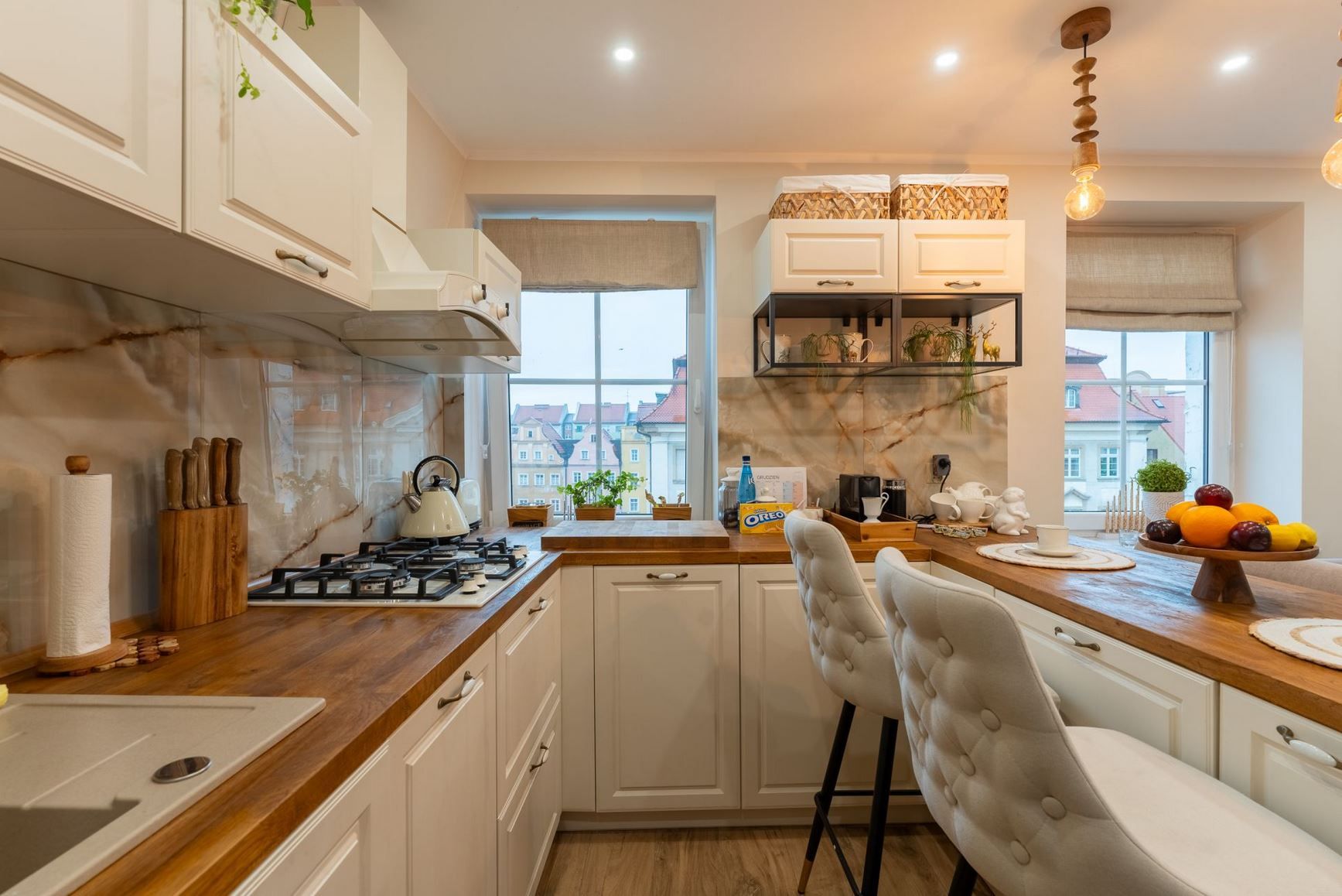 Przestronna, perfekcyjnie wyposażona kuchnia w eleganckim wykończeniu, stworzona z myślą o najbardziej wymagających Gościach. Nowoczesne sprzęty, wysmakowane detale i dopracowana estetyka podkreślają wysoki standard apartamentu.